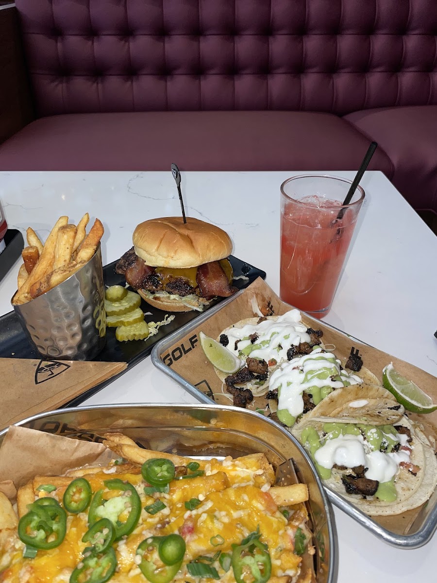The restaurant setting is equally appealing. With a full bar, you can enjoy signature cocktails, craft beers, or non-alcoholic beverages as you take in the atmosphere. The space is designed to be both relaxed and vibrant, with large screens displaying sports and a lively crowd creating a fun, energetic environment. It’s the kind of place where you can kick back with friends, enjoy great food, and still get competitive on the golf range.